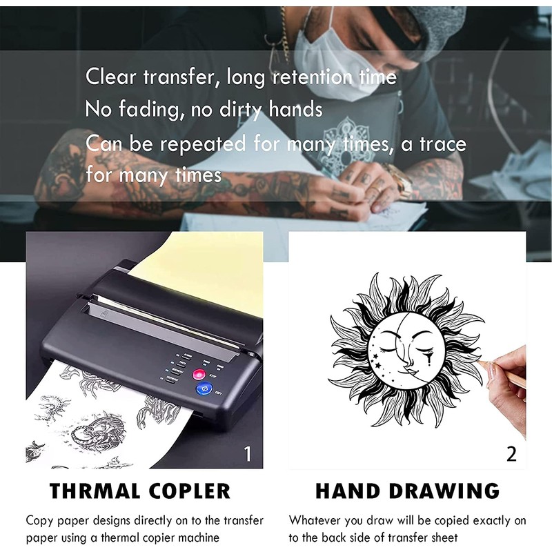 - Copy method: the transfer paper for tattoo templates can be used in thermal copiers or handmade stencils with good transfer effect.Or just trace an original design with a ballpoint pen for hand-drawn stencils.