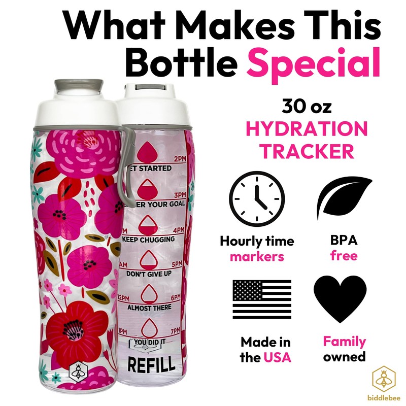 • Track Your Hydration Effortlessly: This measured water bottle with time markers is 100% Made in the USA and crafted to inspire hydration with fun, fashionable prints. Hourly reminders help you meet daily goals and keep you refreshed all day.