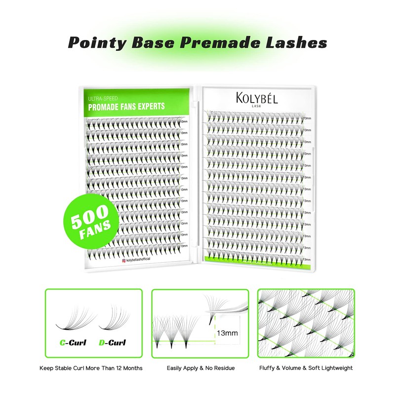 - COST EFFECTIVENESS:Kolybel pre made fans lash extensions 500 fans/ box,8-15mm single length & mixed Length lash tray. Premade fans eyelash extensions mixed lash tray are more affordable and durable. Meet your needs in length, curl and thickness, and help you save money and time on choosing eyelash extensions.