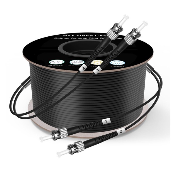 500FT/150M ST to ST Outdoor Armored Fiber Optic Cable, Direct Burial Industrial TPU Duplex Singlemode Fiber Patch Cable, 2 Core OS2 9/125um Optic Internet Cable with Pulling Eye Kit, OD-5mm, Black