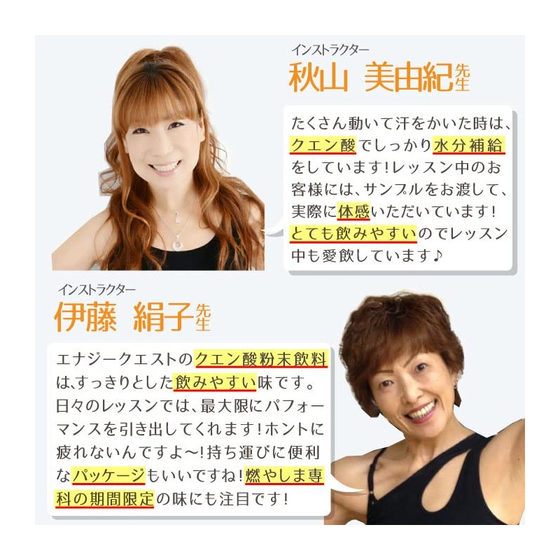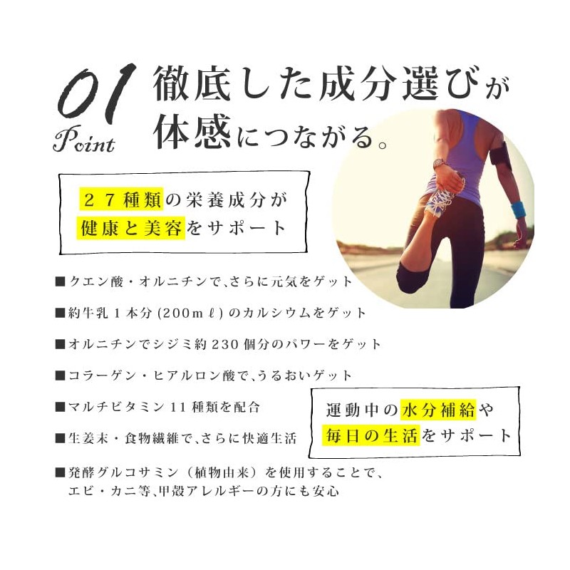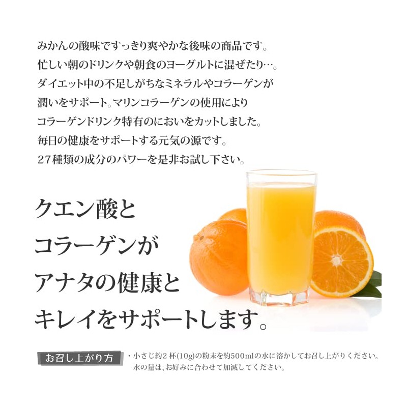 - ご使用方法 ・約10gの粉末を約500mlのお水・お湯に溶かしてお召し上がりください ・お水・お湯の量はお好みに合わせて加減してください ・運動時などの水分補給にお飲みください ・ヨーグルト、牛乳、アイスクリーム等に振りかけたり、混ぜたりしてもお使いいただけます ・お料理にもお使いいただけます 内容量と成分 ■内容量:500g ■有効成分: [クエン酸] オリンピック選手が愛飲していることで話題になった、クエン酸のカギを握る重要な成分です。忙しい方や元気をゲットしたい方をサポートします。 [コラーゲン] たんぱく質の一種で美容には欠かせない大切な成分です。 [グルコサミン] 軟骨成分の一つで、ヒアルロン酸のもとになることが知られています。 植物由来の発酵グルコサミンを使用しています。 [ヒアルロン酸] 1gで6Lもの水を保水する力があります。 また、コラーゲンをサポートする成分です。 フィッシュ由来のヒアルロン酸を使用しています。 [マルチビタミン] ビタミンA、ビタミンB群、ビタミンC、ビタミンD、ビタミンEを配バランスよく配合しました。