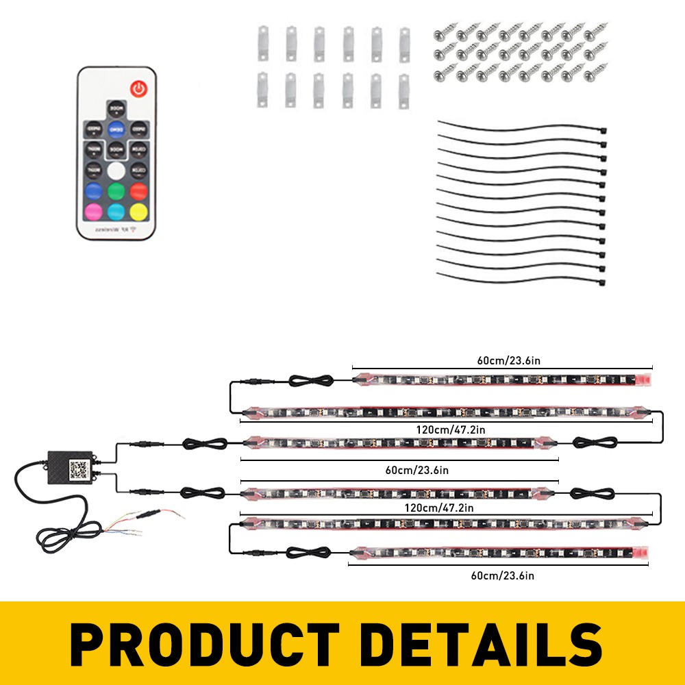 Packaging included: 2x LED light strip(47.2inch) 4x LED light strip(23.6inch) 1x Remote Control 1x Installation Kit