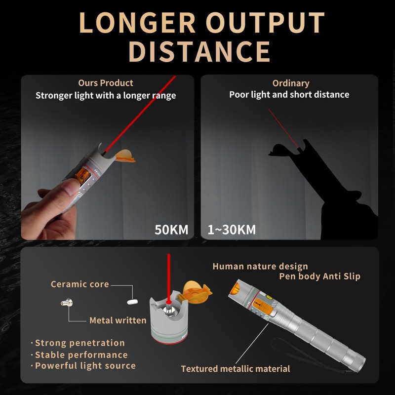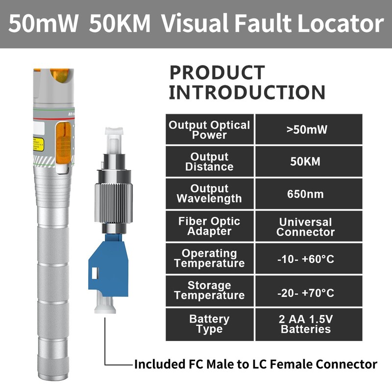 - 50km Fiber Optic Visual Fault Locator with FC/LC Adapter Kit, VFL Includes Singlemode 9/125µm FC Male to LC Female Fiber Light Pen for CATV Telecom and Maintenance Work