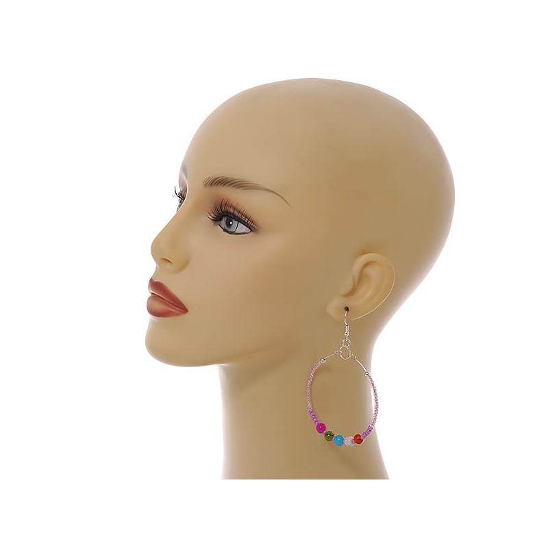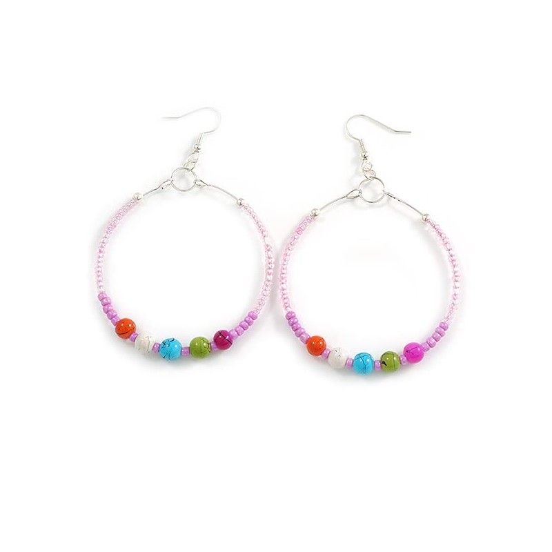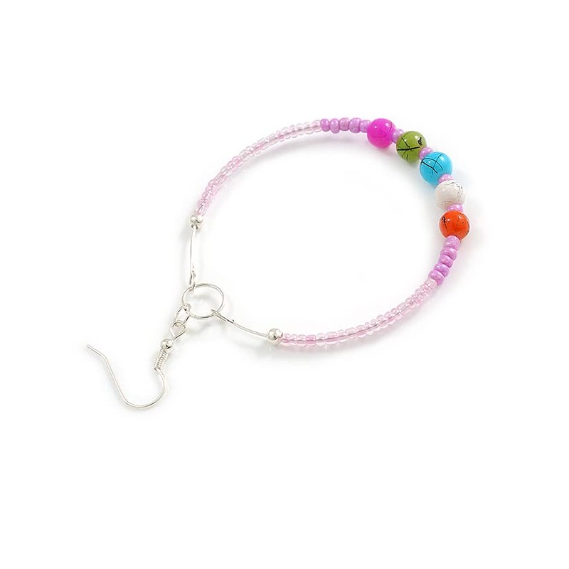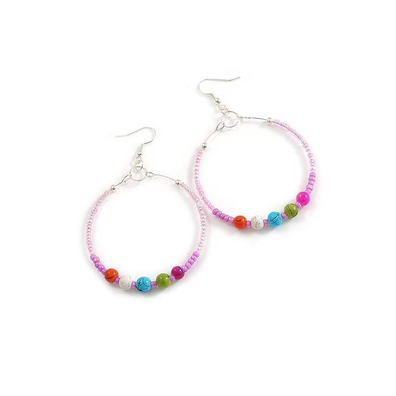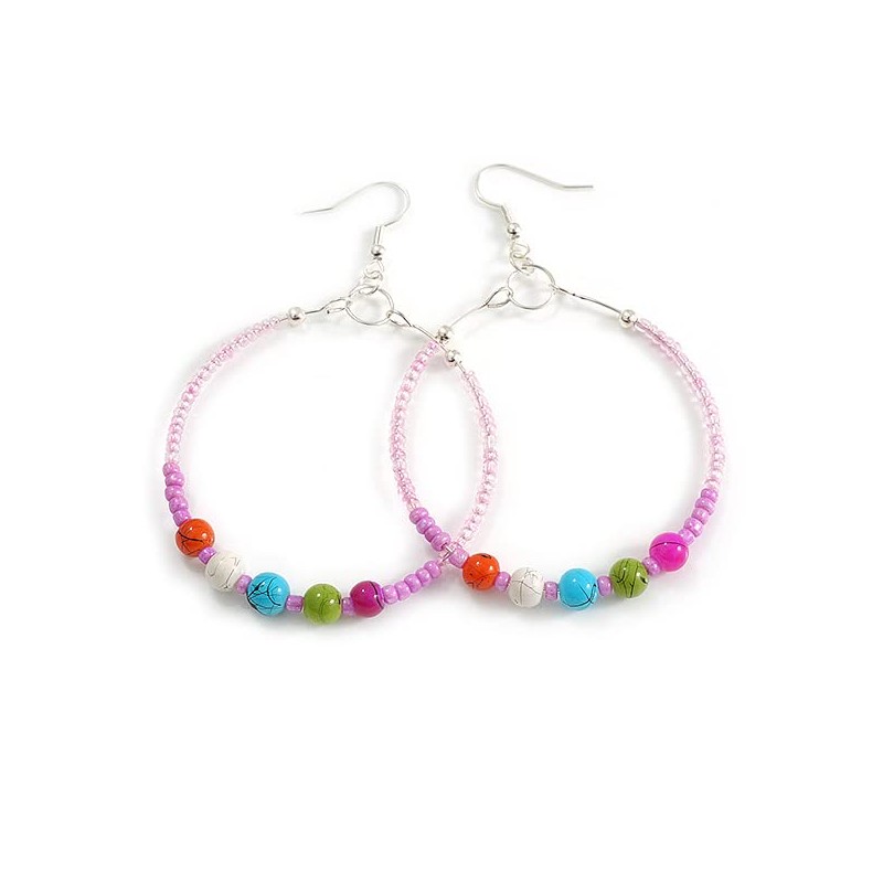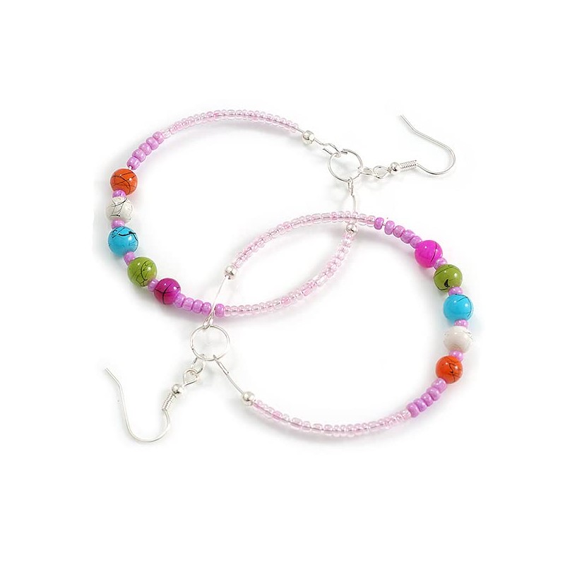 50mm Pink Glass and Multicoloured Ceramic Bead Large Hoop Earrings in Silver Tone - 75mm Drop