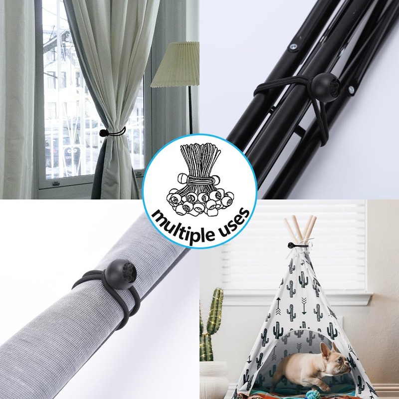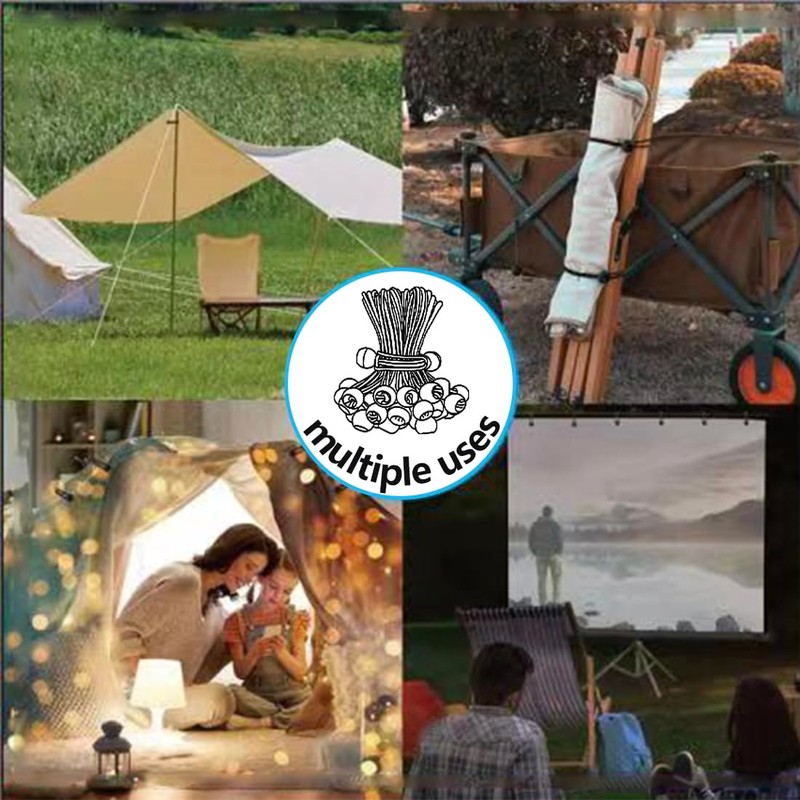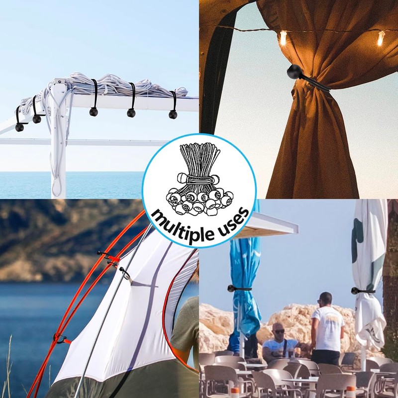 - [Versatile &Application]--Our bungee cords are perfect for securing outdoor equipment withstand extreme weather conditions.These ball bungee cords have a multitude of uses:tent tie downs,tarps,conditionlight strips,electric wire,securing automotive Items,shades,sleeping bags,camping,cargo,motorhome,etc.
