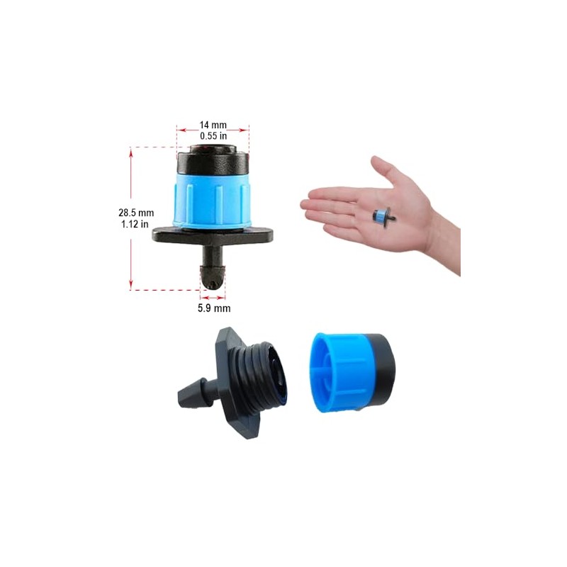 - 1.Specifications- Connectable to 4 mm/7 mm or 0.16”/0.28”( inner/outer diameter) tubing.Maximum Operating Pressure: 40 psi.Maximum water flow rate:18GPH.Maximum diameter of sprinkling:6.5 feet.