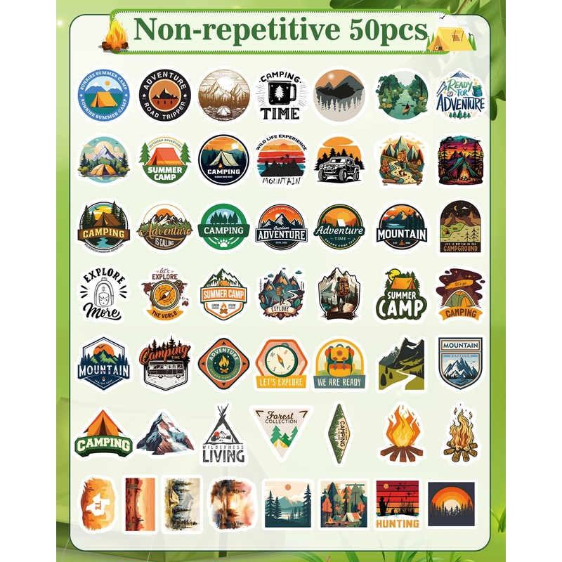 - Vibrant Camping Stickers Pack: This set includes 50 cartoon-style stickers featuring fun and engaging designs related to travel, camping, hiking, and adventure. Perfect for outdoor enthusiasts, these stickers are ideal for creating delightful and personalized artworks.