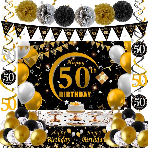 - Value Package 50th Birthday Decorations for Men Women: 50th black gold birthday party decorations kit includes, 1pc black gold 50th happy birthday backdrop banner, 1 set 50th happy birthday flag bunting, 6pcs black gold hanging swirls and 6pcs 50 birthday pendants, 12pcs gold latex balloons, 8pcs black latex balloons, 10pcs silver confetti balloons, 1pc happy birthday tablecloth, 6pcs paper pompoms, 1pc ribbon, 1pc dot glue.