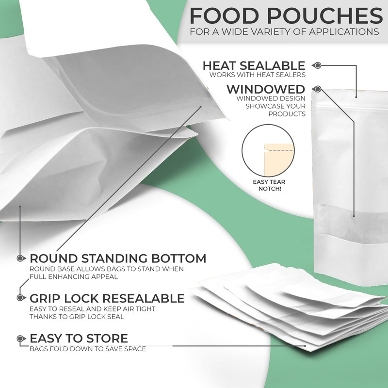 Evergreen Goods 50 x Food White Kraft Bags with Window Stand Up Heat Sealable, Ziplock Seal Reusable Paper Bag Resealable Large Food Storage Pouch - Available in 6 Sizes