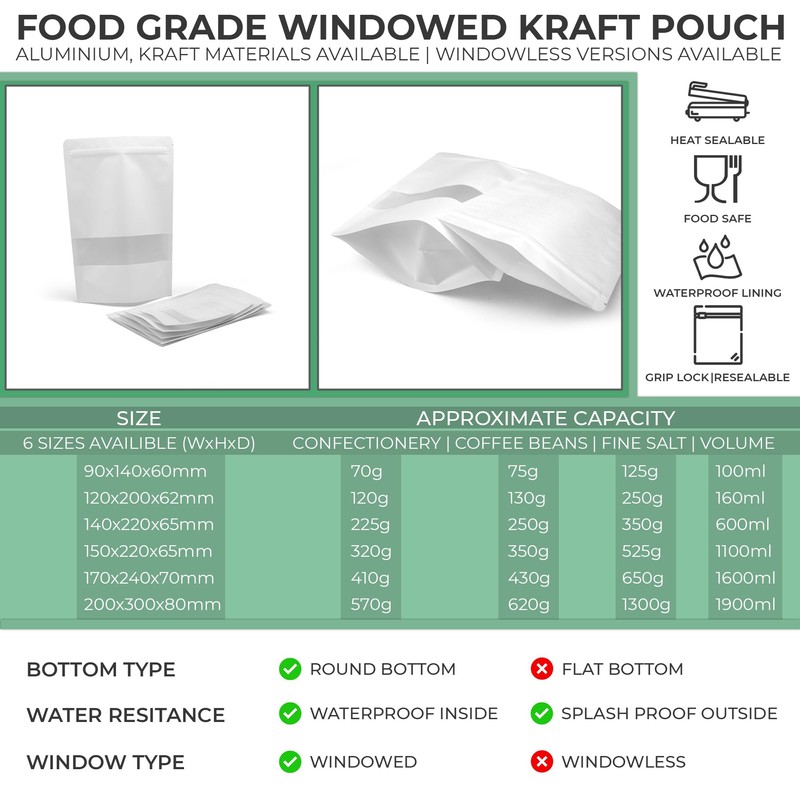 50x White Kraft Bags with Window for Food | 6 Sizes | Heat Sealable, Tear Not...