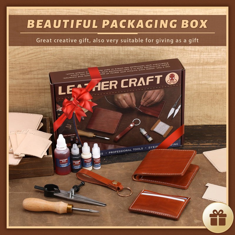 - Leather Working Kit: This leather Making kit contains the materials and tools needed to make leather wallets, card holders, and key chains, including vegetable tanned leather, leather edge bevelers, leathercraft compasses, waxed thread, leather needles, leather paint, leather rivet, and more. You can easily start and finish beautiful leather arts