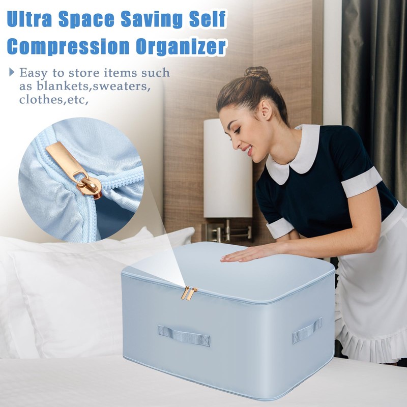 - Blue Ultra Space Saving Self Compression Storage Bag: Self compressing storage bags can be used to store blankets, blankets, down jackets, sweaters, and more. Can help you better organize and tidy your wardrobe, creating a neat and orderly dressing room