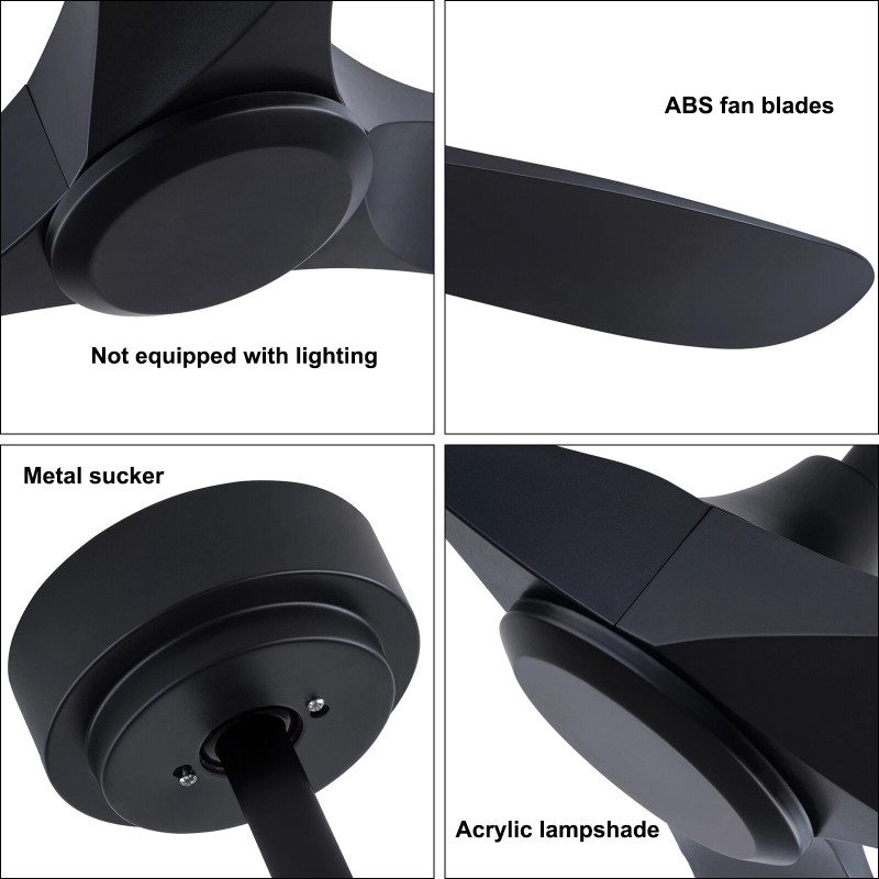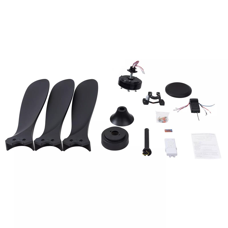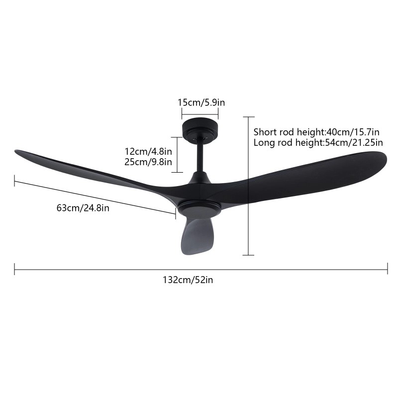SpecificationsPower: 50WVoltage: 85-265VEfficiency: EMaterial: ABS, MentalColor: BlackControl: Remote Control (Included)Motor: Pure Copper MotorNumber of Blades: 3Number of Speeds: 3 (Low-Mid-High)Light Source: LED ( Not Included)Chandelier Suitable Area: About 10-15m²/107.64-161.46ft²Fan Suitable Area: 15-30m²/161.46-215.28ft²Down Rod Length: 12cm/4.8in, 25cm/9.8inOverall Height: 40cm/15.7in, 54cm/21.25inEach Fan Blade Length : 23cm/9.06inProduct Diameter: 132cm/52inBase Diameter: 15cm/5.9in