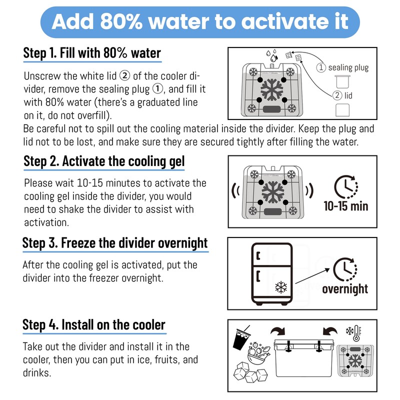 - PLEASE NOTE: For shipping convenience, you need to add 80% water by yourself to activate the refrigeration raw material inside after you receive the package. (There's an 80% water line mark on the divider). Add water and shake for a while, giving it a few minutes to activate.