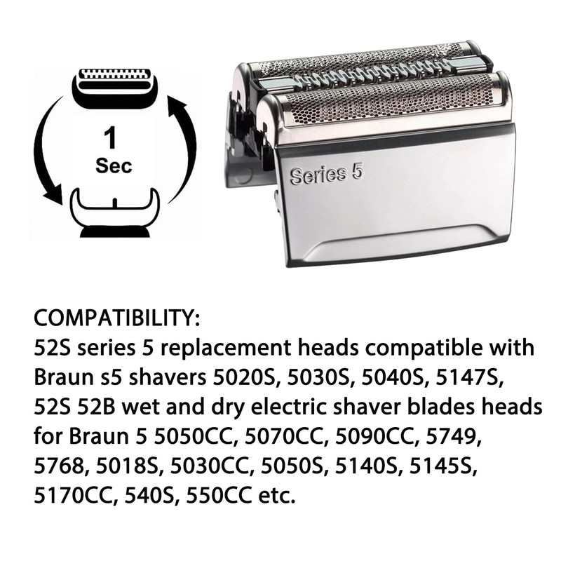 - COMPATIBILITY: 52S series 5 replacement heads compatible with Braun s5 shavers 5020S, 5030S, 5040S, 5147S, 52S 52B wet and dry electric shaver blades heads for Braun 5 5050CC, 5070CC, 5090CC, 5749, 5768, 5018S, 5030CC, 5050S, 5140S, 5145S, 5170CC, 540S, 550CC etc.