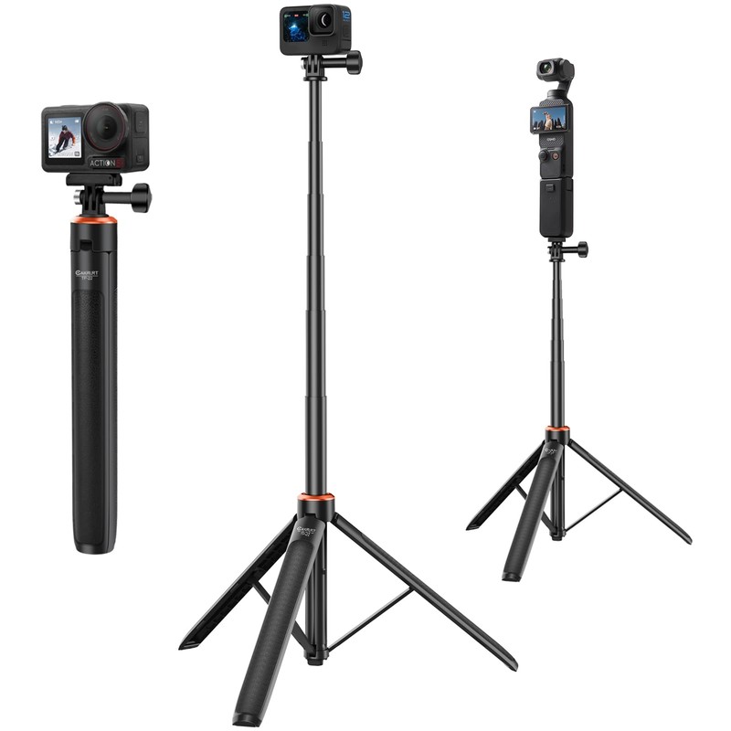 - Selfie Stick + Tripod 2-in-1 Design: Can be used as a handle for action cameras, an extension pole, a handheld selfie stick, or unfold the built-in tripod for fixed point shooting. Perfect for capturing landscapes, vlogs, skiing, selfies, or travel diaries.