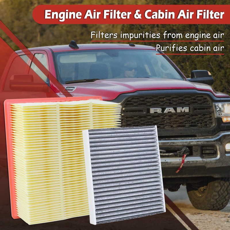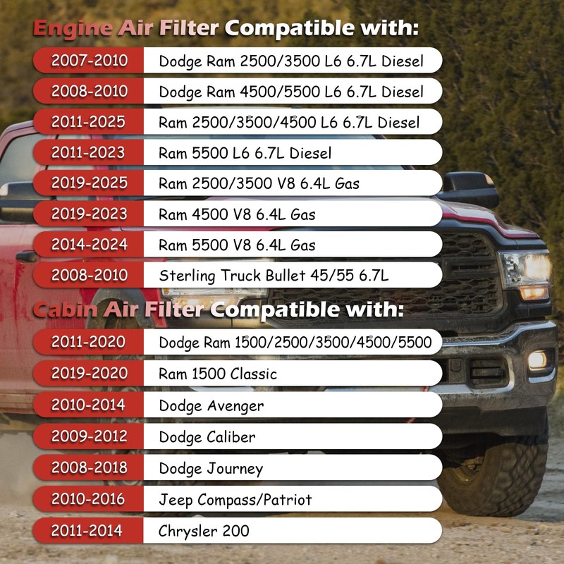 - 【Compatible Models】 Engine Air Filter Compatible with 2007-2010 Dodge Ram 2500/3500 L6 6.7L Diesel, 2008-2010 Dodge Ram 4500/5500 L6 6.7L Diesel, 2011-2025 Ram 2500/3500/4500 L6 6.7L Diesel, 2011-2023 Ram 5500 L6 6.7L Diesel, 2019-2025 Ram 2500/3500 V8 6.4L Gas, 2008-2010 Sterling Truck Bullet 45/55 6.7L. Cabin Air Filter Compatible with 2011-2020 Dodge Ram 1500/2500/3500/4500/5500, 2019-2020 Ram 1500 CLASSIC, Please see details page for more information.
