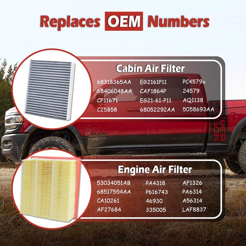- 【Replaces OEM Numbers】 Cabin Air Filter: 68318365AA, 68406048AA, CF11671, C25858, EG2161P11, CAF1864P, EG21-61-P11, 68052292AA, PC4579x, 24579, AQ1138, 5058693AA. Engine Air Filter: 53034051AB, 68517554AA, CA10261, AF27684, PA4318, P616743, 46930, 335005, AF1326, PA6314, A56314, LAF8837.