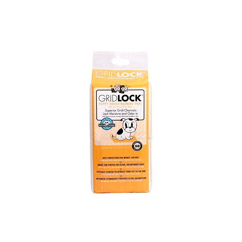 With our new grid-channel technology, Gridlock Housebreaking Pads are the finest protection pad money can buy. A special scent attracts your pet when nature calls, making housetraining easy. Gridlock pads channel moisture away from the surface and return to dryness in seconds. The leak-proof plastic lining and sealed edges prevent damage to floors and carpets and ensures easy clean-up. The advanced technology polymer absorbs and traps liquid better than all the leading brands. No more wetness, no more odor, no more tracks.