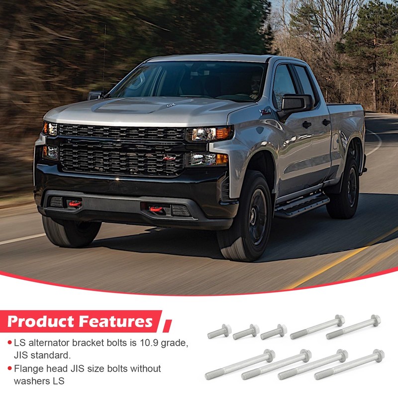 - Durable Construction ===== Crafted from high-quality materials, the Billet bolts in this kit are built to withstand the rigors of engine operation, ensuring long-lasting performance and reliable support for the alternator and power steering brackets