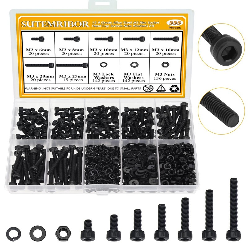 - √ Package Included: 555 pieces Sutemribor M3 x 6/8/10/12/16/20/25mm black hex socket head cap screws nuts washers are packaged in a clear plastic box, we put screws nuts washers in 10 grids, each size is marked with a clear label, which is very convenient for you to carry and use. If you have any questions, please free to contact with us and we will reply to you as soon as possible.