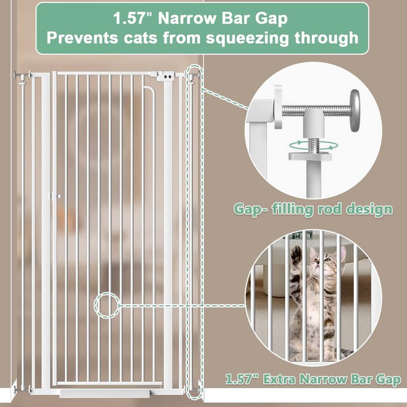 - Ultra Narrow Spacing: Extra tall cat gate the space between the tubes is 1.57", ultra-narrow so that pets can not drill out from it or stuck their heads between it, better safeguarding from danger. Besides, Extra tall pet gate the package will come with two densification rods, which can be put at the ends of the gate if the gap is too large.