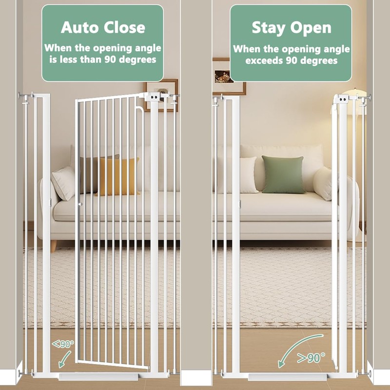 - Considerable Design: The lock system is in the middle of tall safety gate, convenient for daily use. Besides, tall wide gate can be opened towards both sides and will stay open at 90° and auto close when it's less than that. In this way, you can easily walk through this gate for cats indoor extra tall without frequent opening and closing.