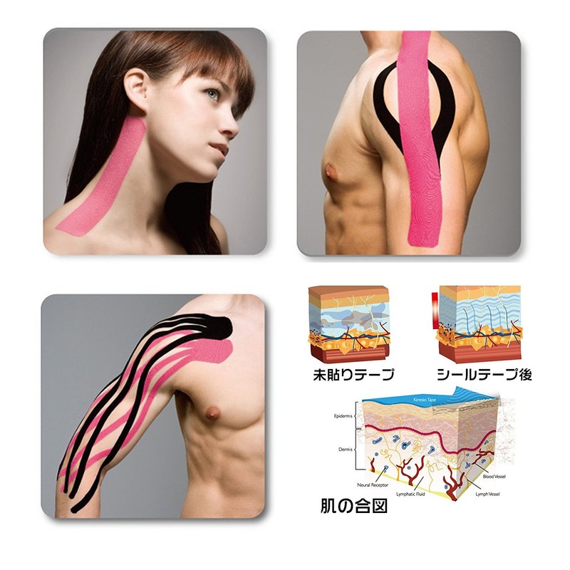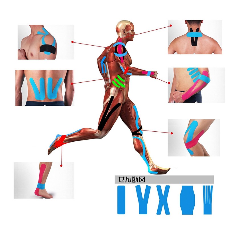 - 医用テープ素材を採用して、運動中の関節・筋肉の伸びを制限することで、痒みと痛みの緩和、予防をはかったり、筋肉の過剰伸を防ぐことに役に立ちます。