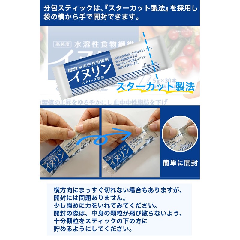 • ✅【内容量】150g(5g×30本) 【原材料名】水溶性食物繊維・イヌリン 【原産国】タイ 【原材料】サトウキビ【包装国】日本 【発送】にんにく玉本舗・株式会社燦樹より発送いたします。 【栄養成分(5gあたり)】エネルギー:10kcal、たんぱく質:0g、脂質:0g、糖質:0.3g、食物繊維:4.5g、食塩相当量:0g【機能性表示食品】届出番号 I1201 ※食品表示法の定めにより、パッケージ裏面の一括表示には原材料イヌリンの由来植物(サトウキビ)の表記を省いていますが、サトウキビ以外の材料は使用しておりません。