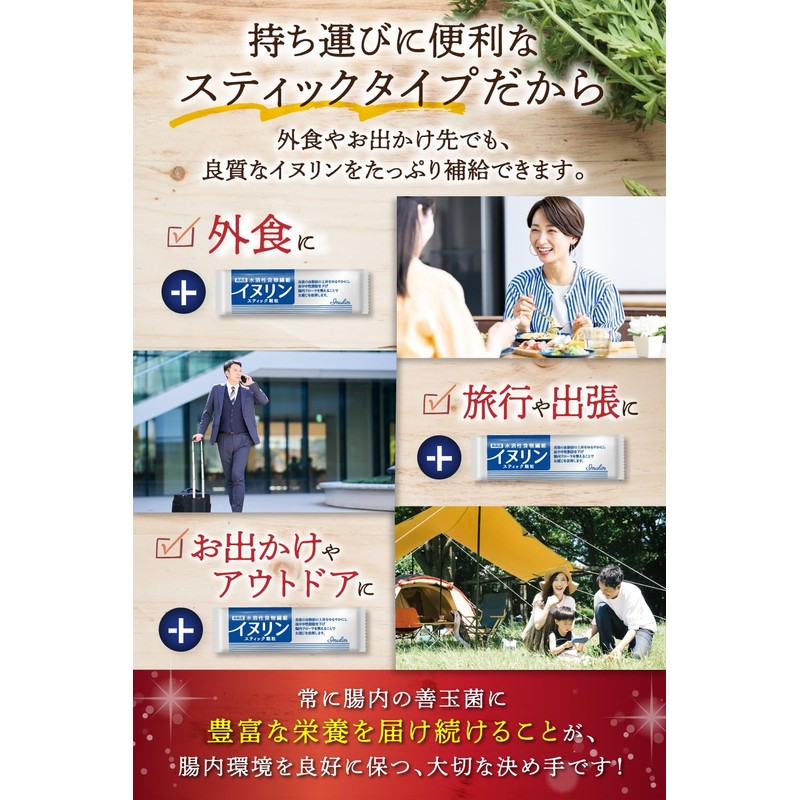 • ✅モンドセレクション4年連続最高金賞&国際最高品質賞ダブル受賞の【高純度 水溶性食物繊維 イヌリ】を、成分はそのまま、より溶けやすい顆粒状にして、持ち運びに便利なスティックタイプにしました!お出かけにはスティック顆粒、ご自宅ではコストパフォーマンスに優れた粉末タイプで毎日の食物繊維摂取を切らさないようお勧めします。✅【高品質と安全性が認められ機能性表示食品の認可を取得しました】本品にはイヌリンが含まれています。イヌリンは食後の血糖値の上昇をゆるやかにすることが報告されています。またイヌリンは血中中性脂肪を下げることが報告されています。さらにイヌリンは善玉菌として知られているビフィズス菌を増やし、腸内フローラを整えることでお通じを改善しおなかの調子を整えることが報告されています。