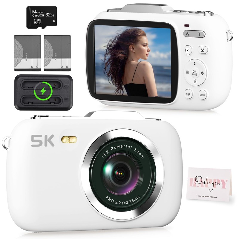 5K Vlogging Camera,80MP UHD Portable Digital Cameras for Vlogging,18X Zoom Travel Point and Shoot Camera with 32GB TF Card,Photography Cameras for Beginners Teen - White