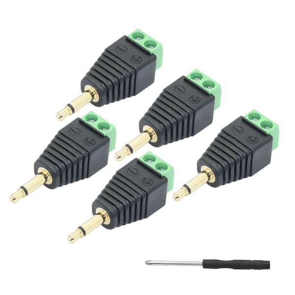 5Pcs 3.5mm Audio Terminal Block Connector, Gold Plated TS 2 Pole 1/8 inch Mono Male to 2 Pin Solderless Screw Terminal Female AUX Audio Adapter with Screwdriver