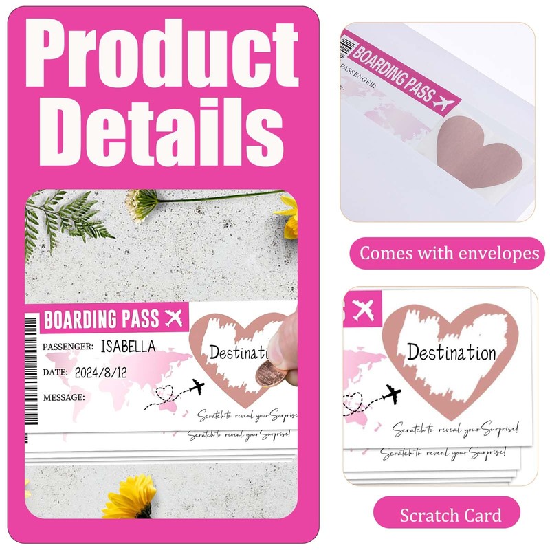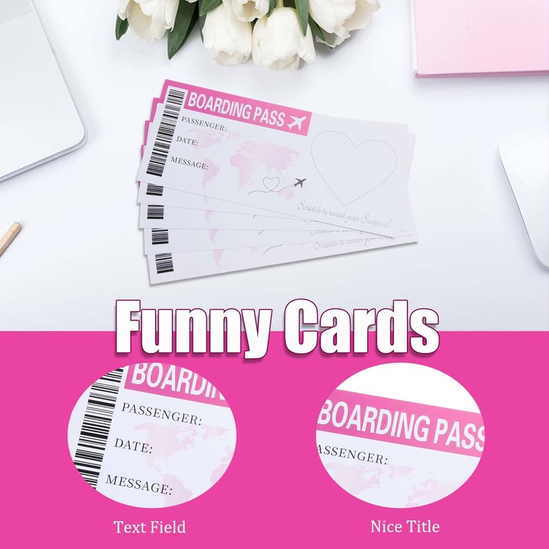 - Unique Surprise Reveal - Each card comes with a white envelope and a matching scratch off sticks. You can customize your own 'destination' information. Put the card into a envelope and hand it over to the recipient. When the recipient open the envelopes, they will definitely be surprised!