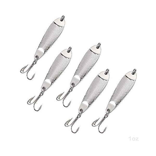 5pcs Fish WOW! 1oz Casting Spoon Jig Lures Hopkins Style Hammered Spoons with a Treble Hook - Silver