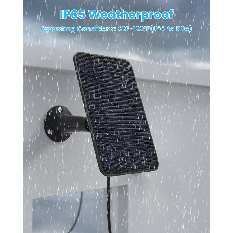- 【IP65 Weatherproof Design & Rubber Plug】The blink camera solar panel is IP65 weatherproof, the surface is made of monocrystalline silicon material, the frame and bracket are made of plastic alloy, which can resist heavy snow, heavy rain and other severe weather conditions. Working conditions: 32℉-122℉(0°C to 50°C). Can be installed outdoor anywhere to provide solar energy for your blink outdoor camera. With rubber plug to prevent rainwater entering the camera.