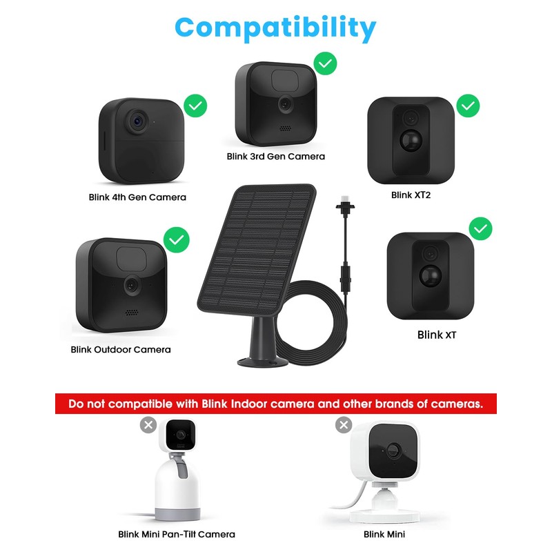 - 【Upgraded Solar Panel for Blink Camera】This 5W solar panel charger with battery compatible with Blink Outdoor (4th & 3rd Gen), XT XT2 camera. Provides 365 days continuous solar power supply for your Blink camera. (Note: Not compatible with Blink XT1/mini/indoor camera. Please remove the batteries from your Blink camera before connecting solar panel).