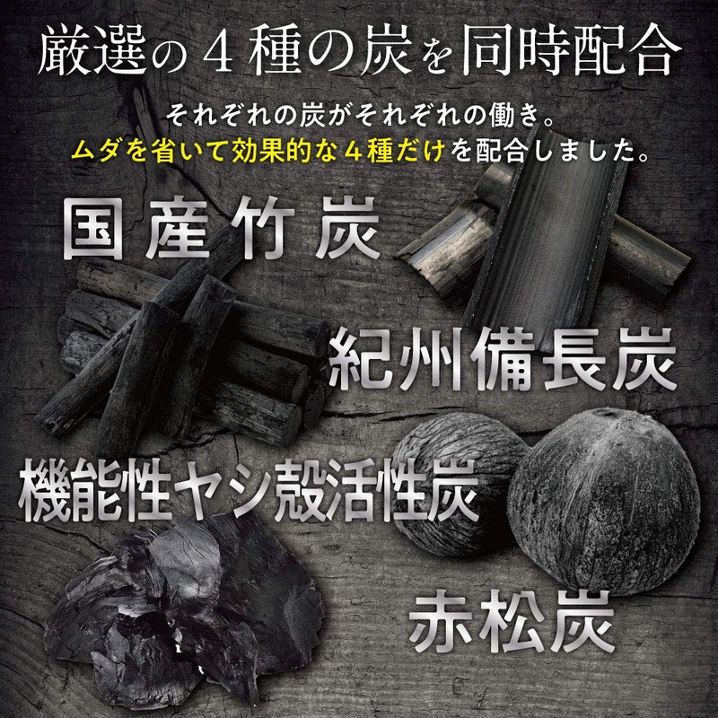 4種類の効果的な炭と、6種類の熟成素材、4種類の菌活サポート成分の同時配合で、驚きの体験を。 特に効果的な4種類の炭を厳選して配合しました。「国産竹炭」「紀州備長炭」「機能性ヤシ殻活性炭」「赤松炭」を独自の配合比率で施した錠剤によって、健康的な毎日に。 さらに長期間熟成発酵させた「黒酢」「黒ごま」「黒豆」「黒ウコン」「醗酵黒ニンニク」「醗酵黒たまねぎ」もたっぷりと配合することで、より健康生活をサポート。 そして「200種類の酵素」「活性酵素」「コンブチャエキス」「有胞子性乳酸菌」と4種類の貴重な菌活成分も追加配合しました。 ※良質の炭の原料仕入れが非常に難しい商品です。予告なく品切れとなる場合がありますのでご注意ください。