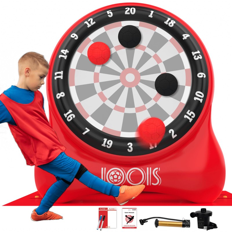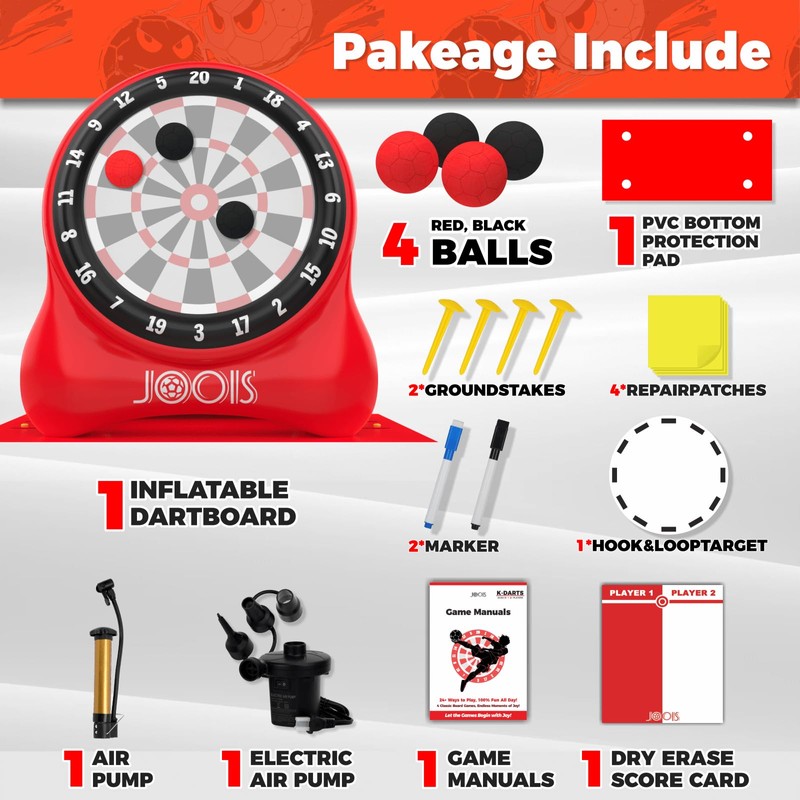 - Package Included: 1 huge inflatable soccer dart board, 2 red kick balls, 2 black kick balls, 1 kickball pump, 1 electric air pump for dart board, 4 ground stakes & repair patches and a soccer games kit