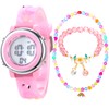 【ペコチャイム】子供 デジタル 腕時計 6歳 以上 女の子 7色LED 防水 ストップウォッチ アラーム ジュエリーセット ネックレス ブレスレット シール ギフトBOX フラミンゴ ピンク