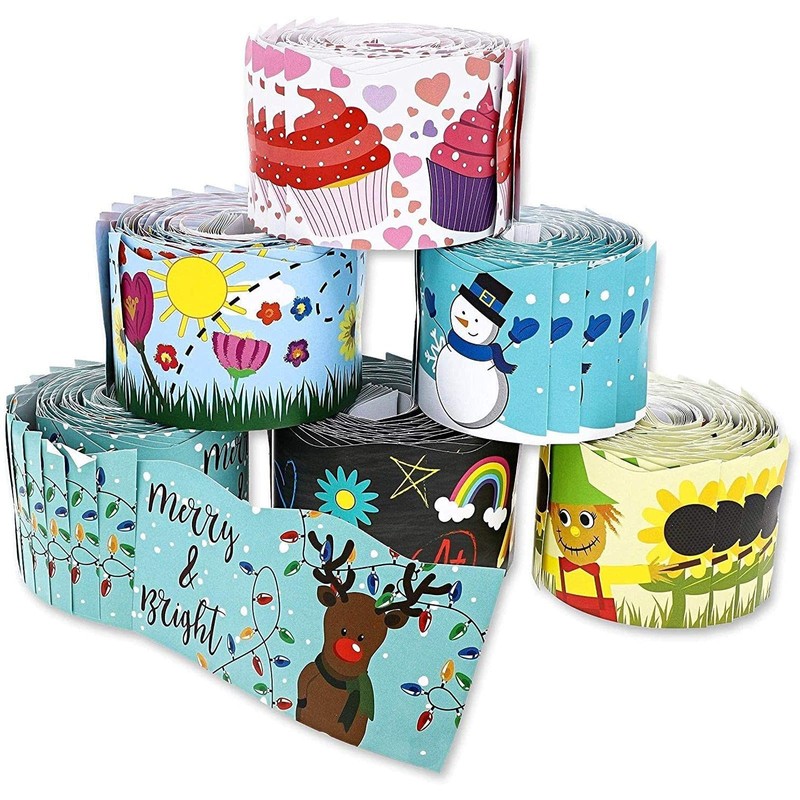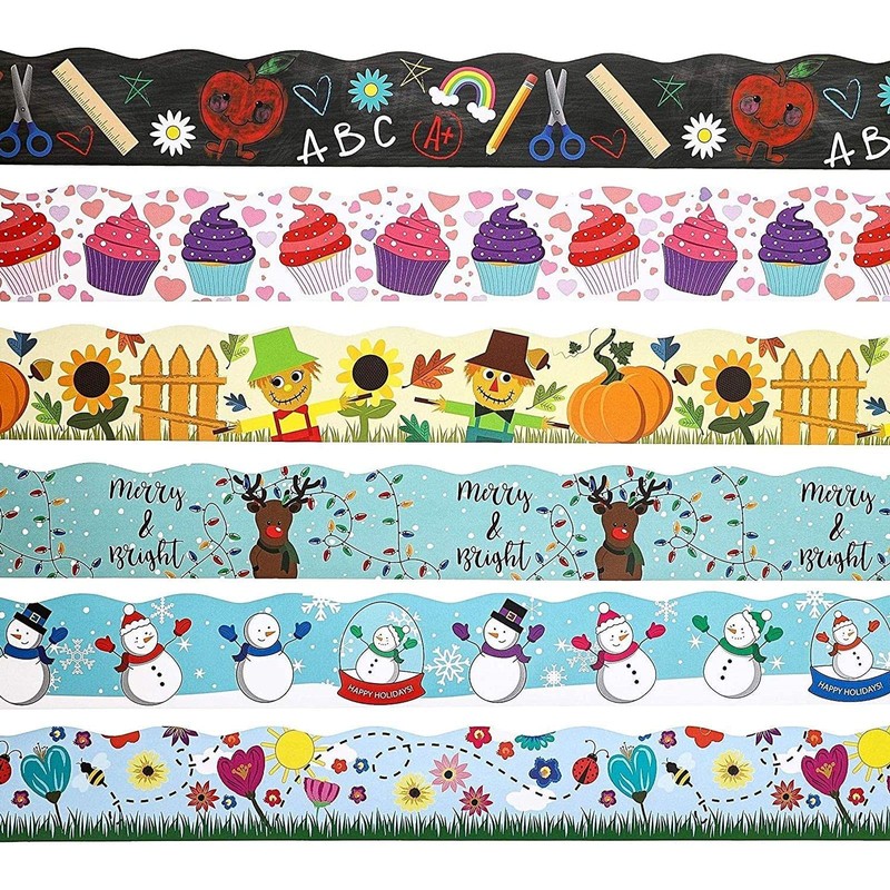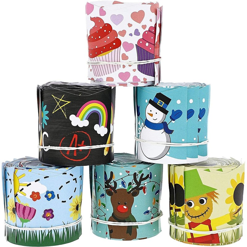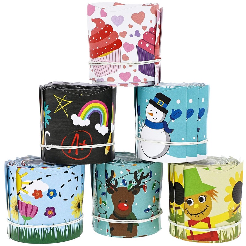 • Bulletin Board Strips: Includes 6 paper rolls with seasonal border trim designs for bulletin board and classroom decor