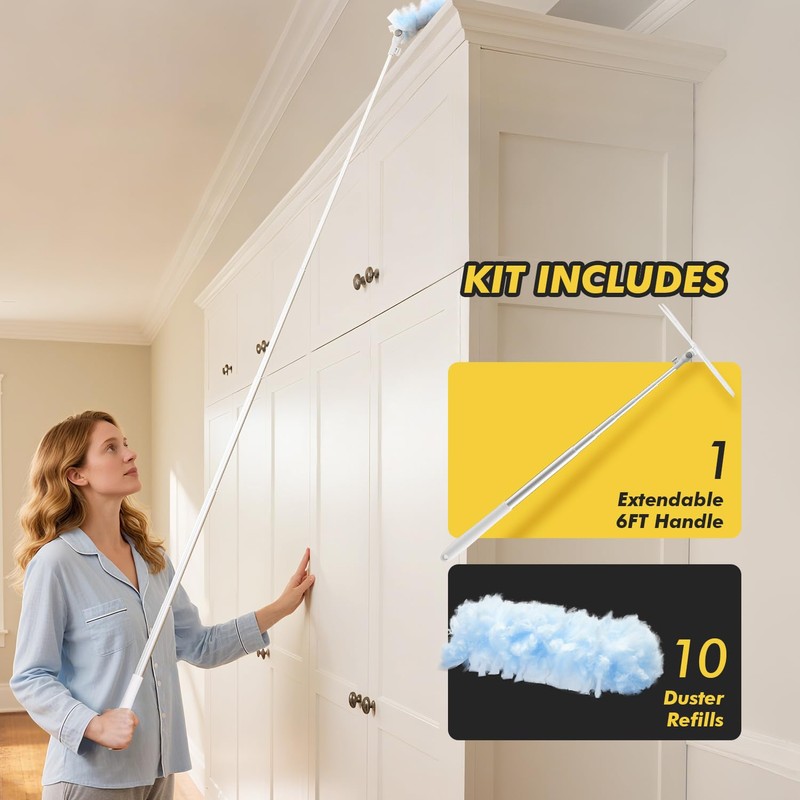 6 ft Extendable Duster Handle with 10 Refills, Compatible with Swiffer, Disposable Microfiber Dusting Pads for Home Cleaning, Ceiling, Fan, Window, Hard-to-Reach Areas