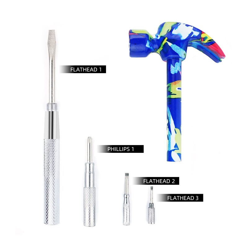 - Tools Included: Multifunctional tool set including metal hammer and screwdriver: Slotted/Flat head screwdriver x 2, Phillips screwdriver x 2, nail puller x1 and claw hammer x 1, claw hammer consists of a metal hammer head and a handle, easy to pack and store.