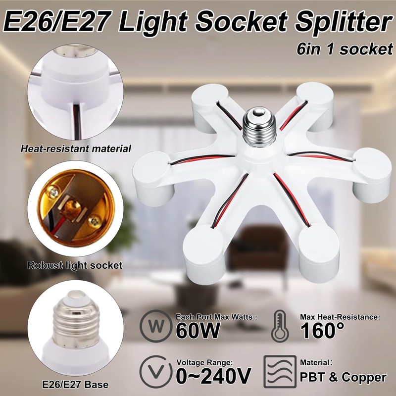 6 in 1 Light Socket Splitter - E26/E27 Light Bulb Splitter Adapter, 6 Way Bulbs Expand Lighting, Standard Base Light Bulb Extension Socket, Lightbulb Extender for LED CFL, Lamp Holder Converter