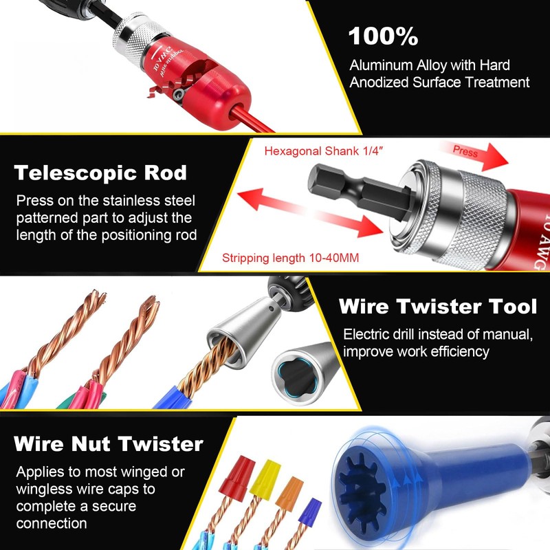 - 💡【MULTIPLE OCCASIONS, STRONG COMPATIBILITY】Our wirestripper AWG kit also includes wire twister, 25 wire caps, and other electrician tools for all your wire work needs. The wire nut twister, wire stripper, and other connecting parts are 1/4 inch hexagonal shank and are compatible with most standard power drills, eliminating the need to purchase additional specialized equipment