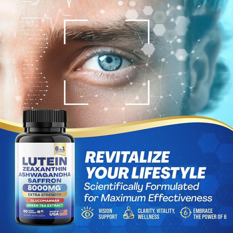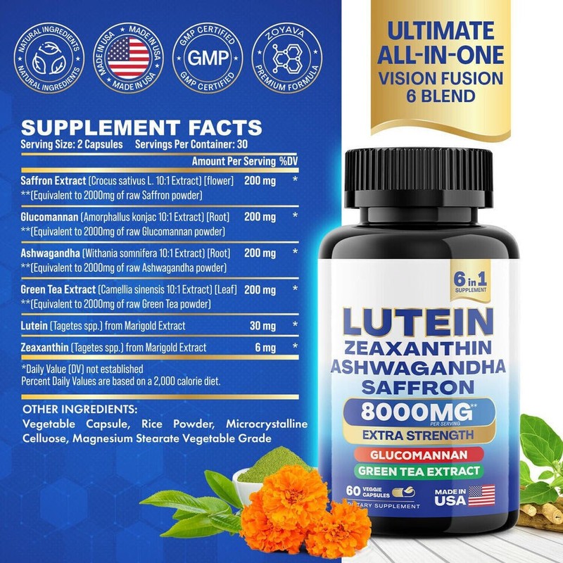 A comprehensive combination of eye vitamins Lutein and Zeaxanthin with Ashwagandha, Saffron Supplements, Green Tea Extract and Glucomannan, enriched with 6 potent ingredients. Experience the power of beta carotene lutein and zeaxanthin supplement, and more in one convenient formula. These lutein eye vitamins capsules provide a great alternative to lutein gummies, saffron gummies, ashwagandha gummies and other eye health gummies.