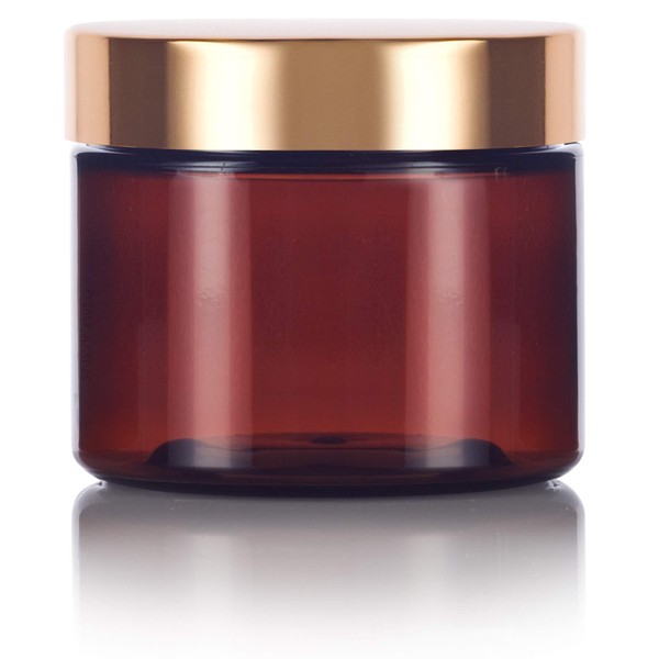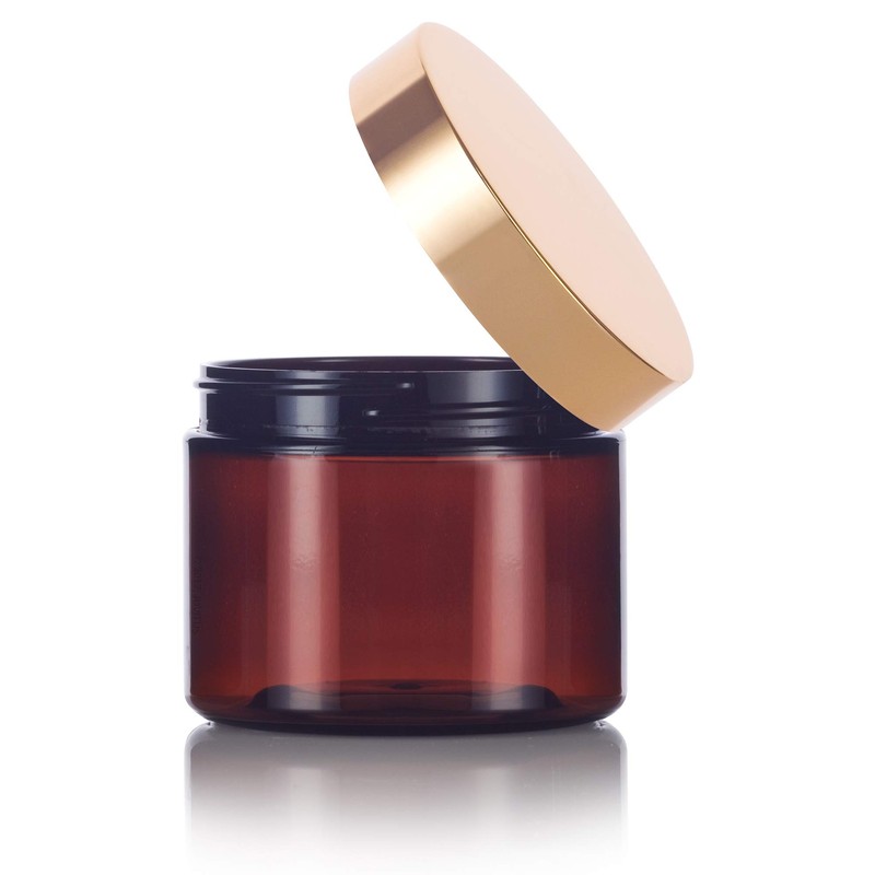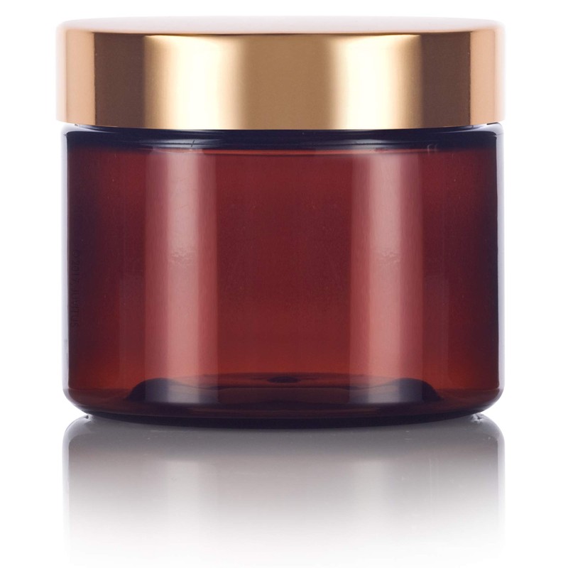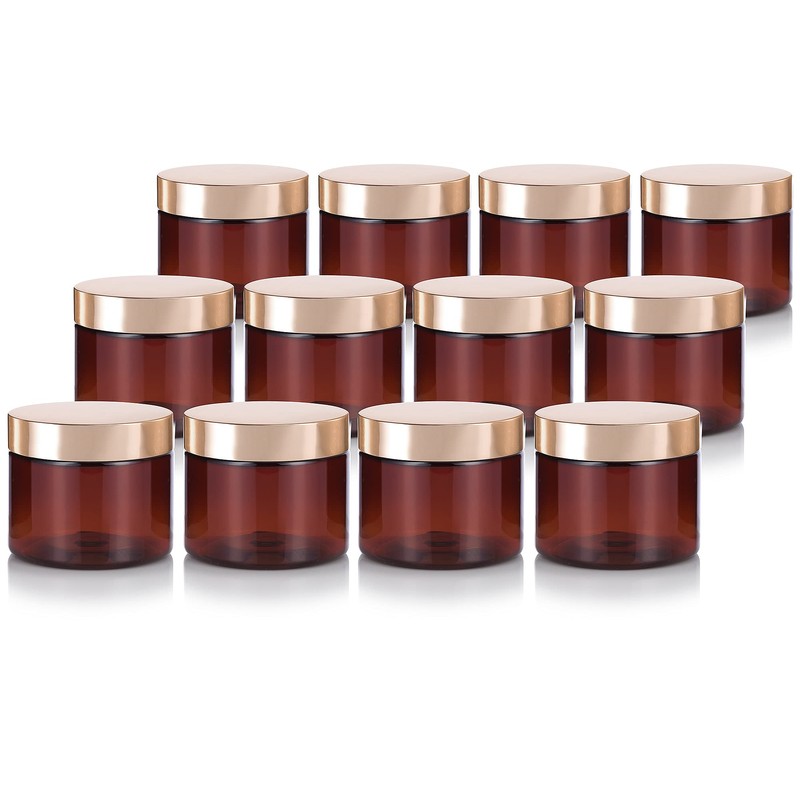 6 oz Amber PET Plastic Refillable Jar with Gold Metal Overshell Lid (12 Pack)