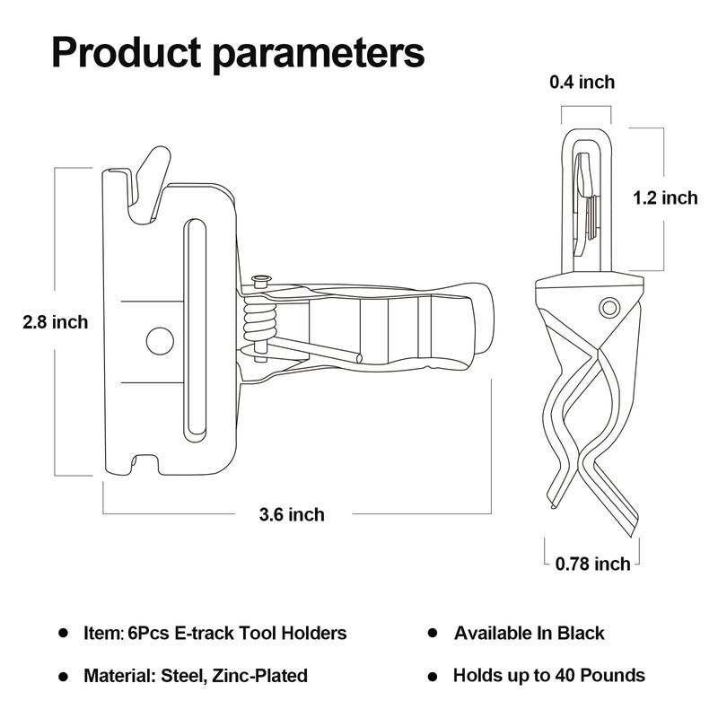 - 🧰【Dimensions】- The E track tool hanger set includes 6 E-track tool organizers and a height of 2.8". Each etrack tool holder is 0.78" wide 3.6" from front to back, see the mechanical sketch image for a visual guide. Maximum Opening Size 1.78". Holds Up to 40 Pounds.
