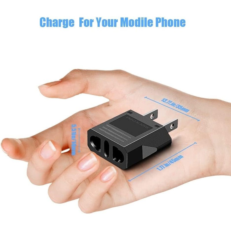 - [ULTRA LIGHT and COMPACT DESIGN]: European to US plug adapter is mini size: 1.8*1.5*0.5in, Weighs only 0.35oz, portable size allows these us plug adapter easily put in your pocket, perfect for travel and home use.