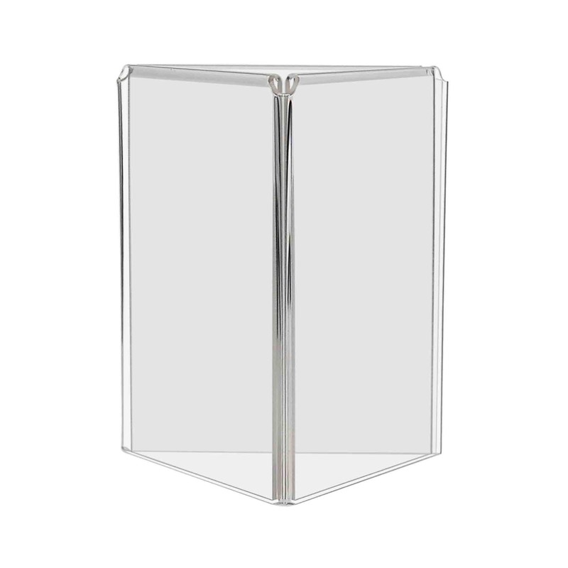 5”W x 7”H Sign Holder Triangle Shape 3 Way Display Clear Countertop Table Tent Product Features: Holds 5"W x 7"H literature 3 Panel Ad Frame Countertop Sign Holder Triangle Shaped Display on desks, tables, and counters in restaurants, bars, retail stores, trade show booths, hotels and other business locations Bottom load design makes sign changes quick and easy Proudly made in the USA with premium high quality plastic This three sided countertop sign holder is perfect for displaying menus, advertising, sales specials, printed media or to showcase documents that you would like to have on display in your retail shop, restaurant or office. This multiple sided table frame is ideal to inform your customers or clients about hours of operation, today's specials, upcoming sales, advertisements or general informational notices. These are lightweight and portable which means they can be placed in the reception area of any business, hotel, cafe, doctors offices or medical facilities. These sign holders can be used practically anywhere, from trade shows to conventions, conferences, expos or any other events. They are easy to use, simply slide your single page signs or any other printed literature anywhere you want the general public and or office staff to see them. Our products can be and have been purchased for businesses like offices, bistros, retail stores, shopping centers, cafeterias, salons, medical facilities, malls, apartment buildings, schools, government and city buildings. These triangle shaped frames are made to use over and over and over again. The light acrylic material is highly durable. These see through holders ensure that your information and graphics stay clean and easily viewable. *All sizes are approximate