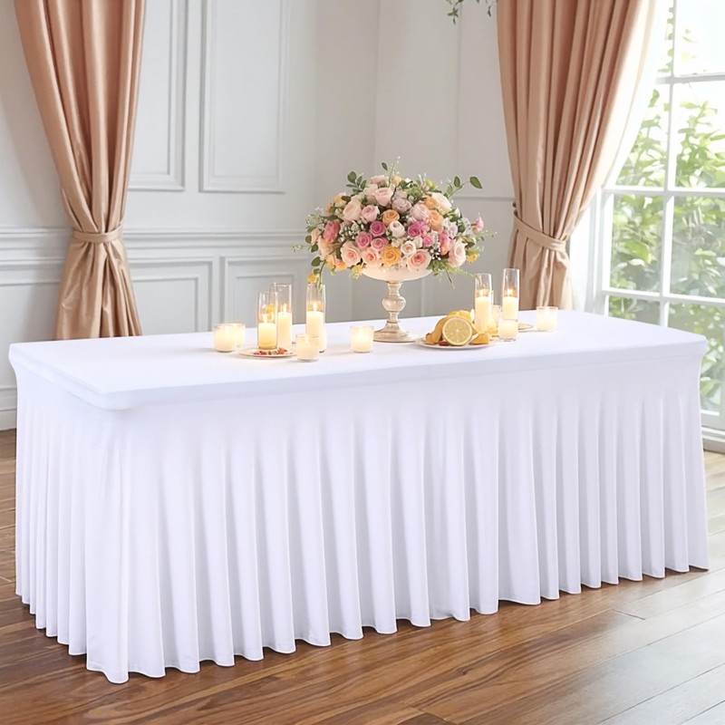 - 【ELEGANT DISPLAY】Our white spandex table skirt will fit your 8 foot folding table perfectly. It really look nice with this on as you can't see the legs of the table, and you can't see through it at all so you can even store things under the table and it will be hidden.
